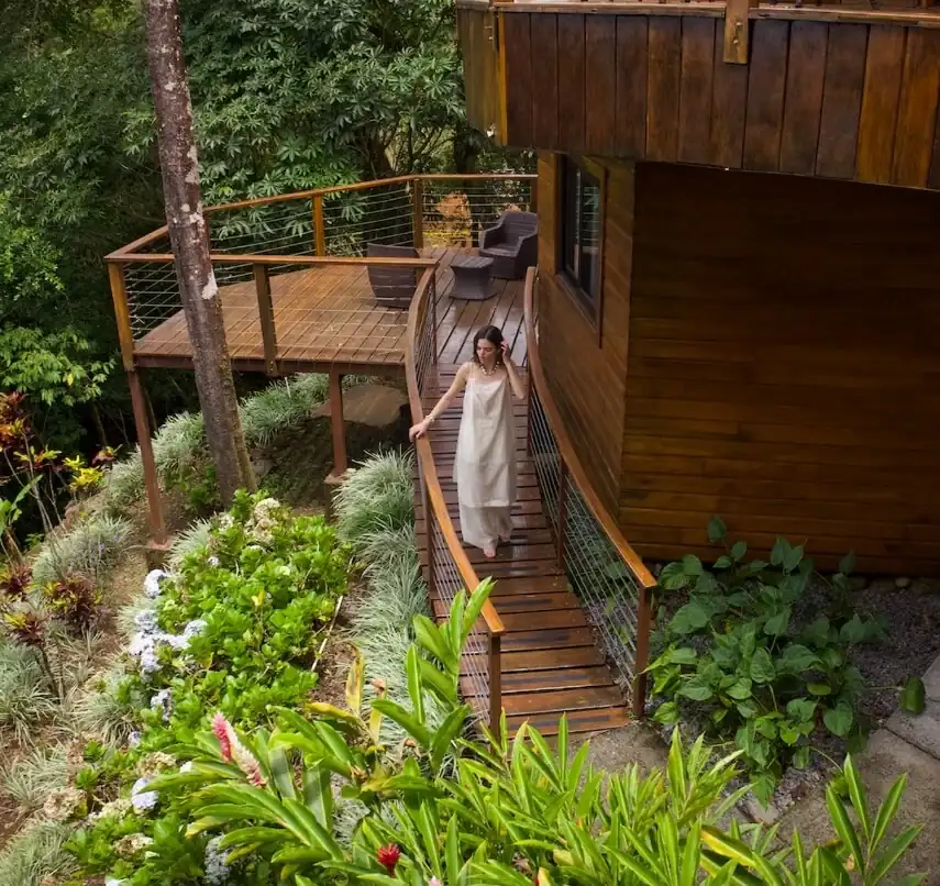 A wooden suspension bridge leads to your private retreat in the sky and a lookout point with a gas barbecue, reserved exclusively for our guests.